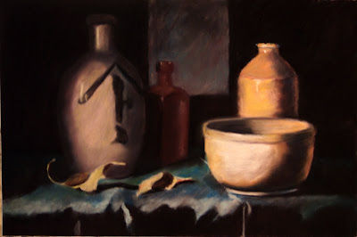 The leaves and table cloth are yet to be "painted", and there will be all kinds of tweaking once I work on them. For one, the left jug will probably be toned down in value because I want the leave to carry the light to the marble bowl.