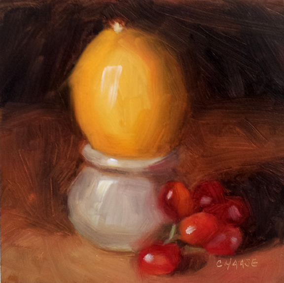 In trying to stay with bold strokes, rich colors and soft edges, I began with the large shapes and then blended the shapes with a large brush. For the impression of a rainstorm on the horizon, I pulled paint down from the dark cloud with a bristle brush. As always, the painting is more colorful and has more depth than the photograph of the painting.